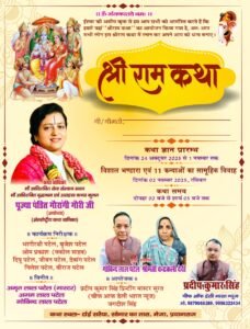 कथा के मुख्य यजमान गोविंद लाल पटेल और श्रीमती चंद्रकली पटेल होंगे। अयोध्या की अंतरराष्ट्रीय ख्याति प्राप्त पंडित गौरांगी गौरी जी कथा का वाचन करेंगी।