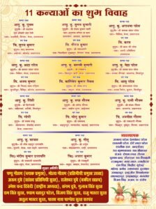 समाजसेवी प्रदीप सिंह द्वारा 11 गरीब कन्याओं का विवाह कराना क्षेत्र में चर्चा का विषय बना हुआ है। प्रदीप सिंह ने कहा कि गरीब कन्याओं का विवाह कराना सबसे बड़ा पुण्य का काम है।सामूहिक विवाह के बाद विशाल भंडारा और दिव्य महाआरती का आयोजन किया जाएगा।