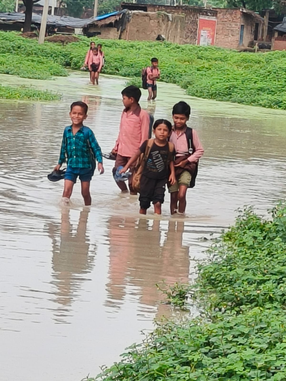 पानी भरे गड्ढे से निकलते हैं स्कूली बच्चे