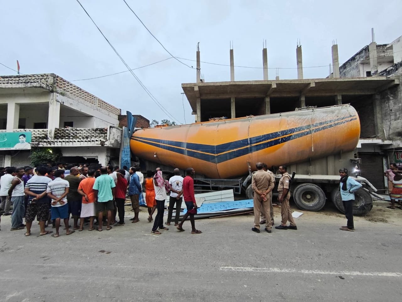 घर में घुसा कैप्सूल ट्रक मकान क्षतिग्रस्त चालक घायल